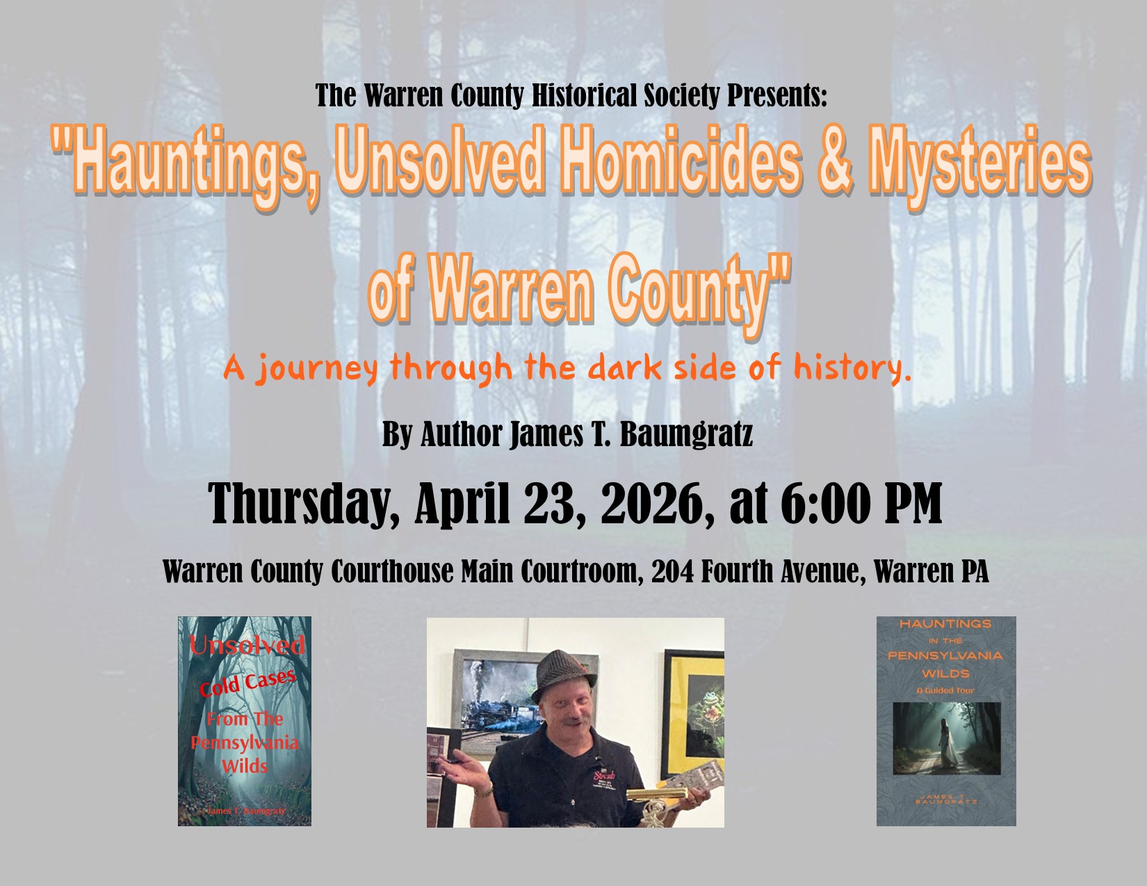 Hauntings in the Pennsylvania Wilds, A Guided Tour Presented by James T. Baumgratz April 23, 2026, at 6 PM Warren County Courthouse, main courtroom 204 Fourth Avenue, Warren, PA