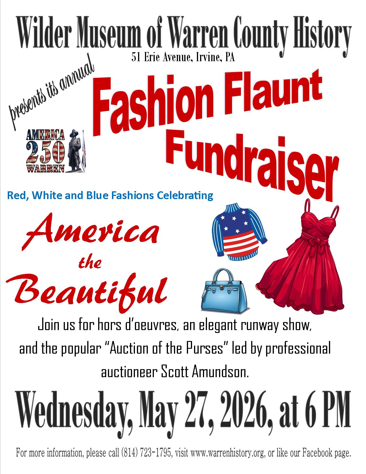 Fashion Flaunt Fundraiser America the Beautiful Wednesday, May 27, 2026, from 6 to 8:30 PM Wilder Museum of Warren County History 51 Erie Avenue, Irvine, PA