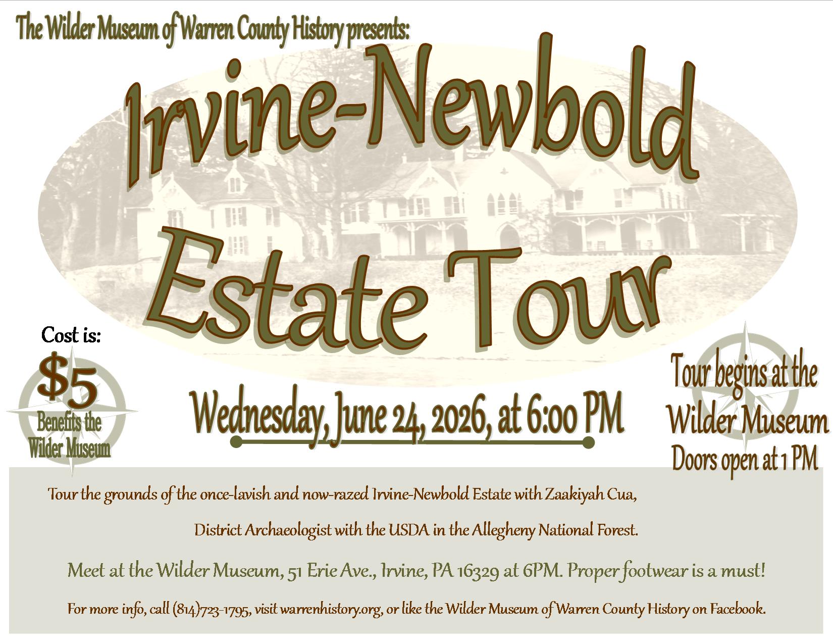 Irvine-Newbold Estate Tour Wednesday, June 24, 2026, at 6 PM Wilder Museum of Warren County History 51 Erie Avenue, Irvine, PA