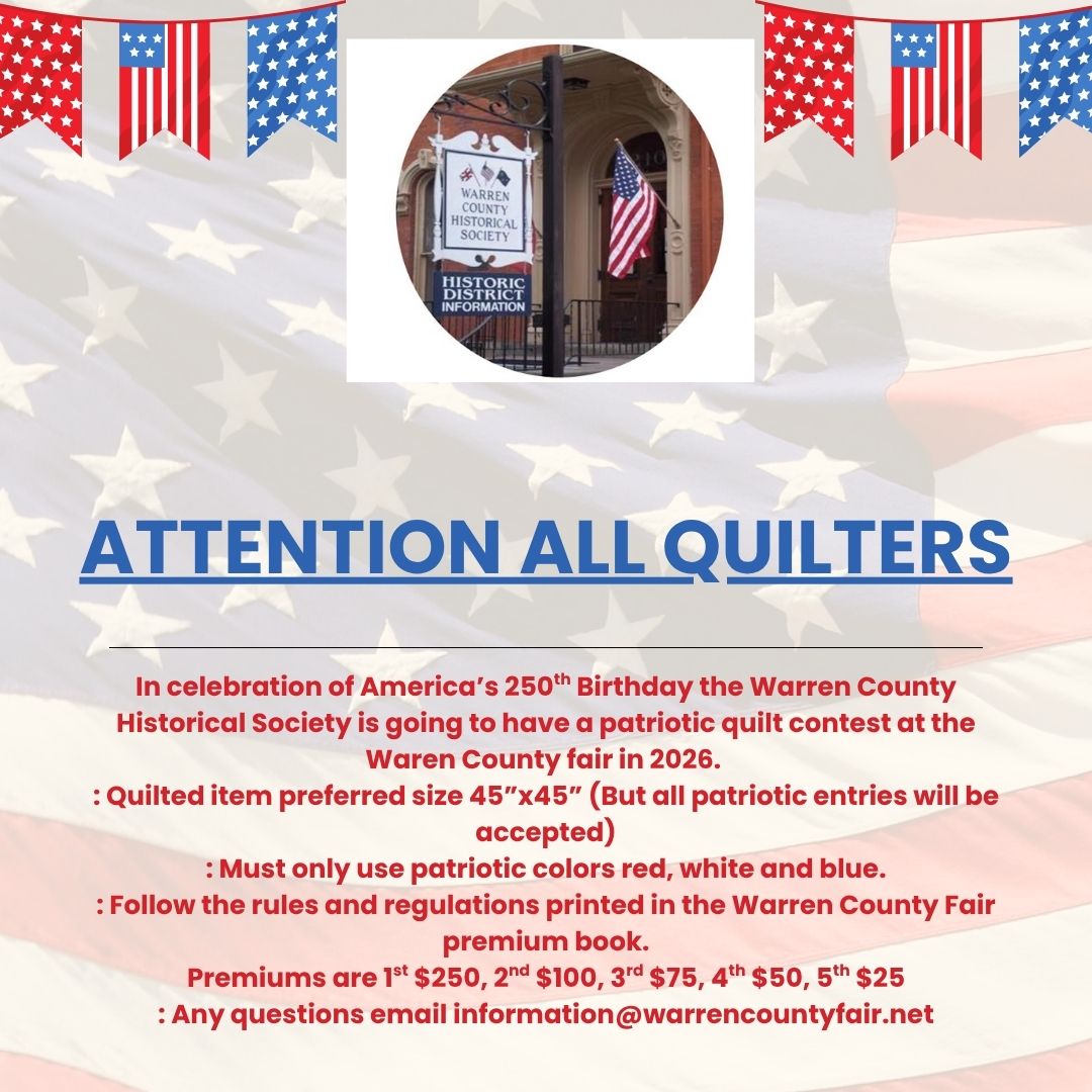 Warren County Fair Patriotic Quilt Contest Sunday, August 9, 2026, 1 to 7 PM submit entries Sponsored by the Warren County Historical Society Warren County Fairgrounds, Pittsfield, PA