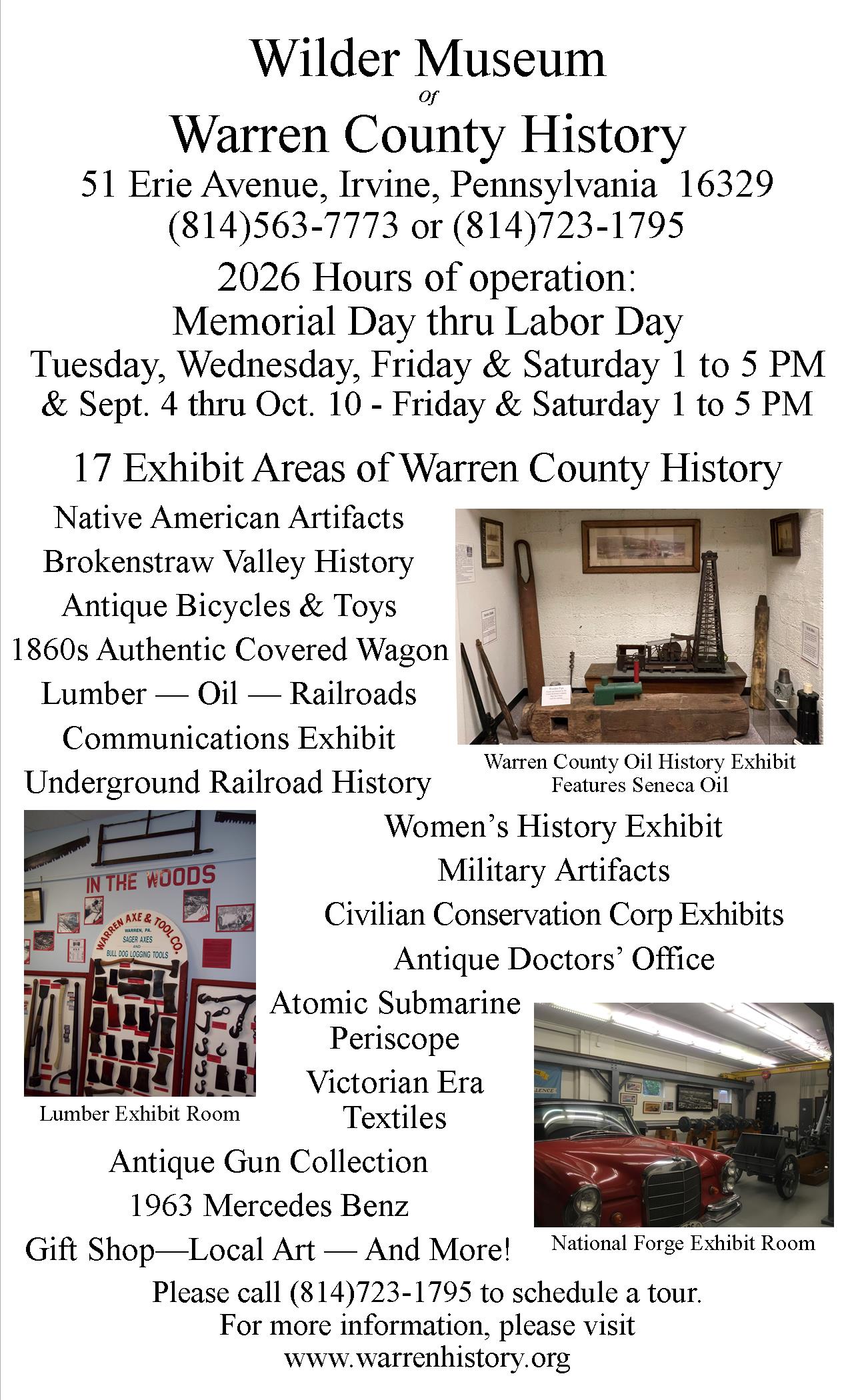 Wilder Museum of Warren County History Opens for the Season Tuesday, May 26, 2026, from 1 to 5 PM 51 Erie Avenue, Irvine, PA Hours of Operation: Tuesday, Wednesday, Friday & Saturday 1 to 5 PM