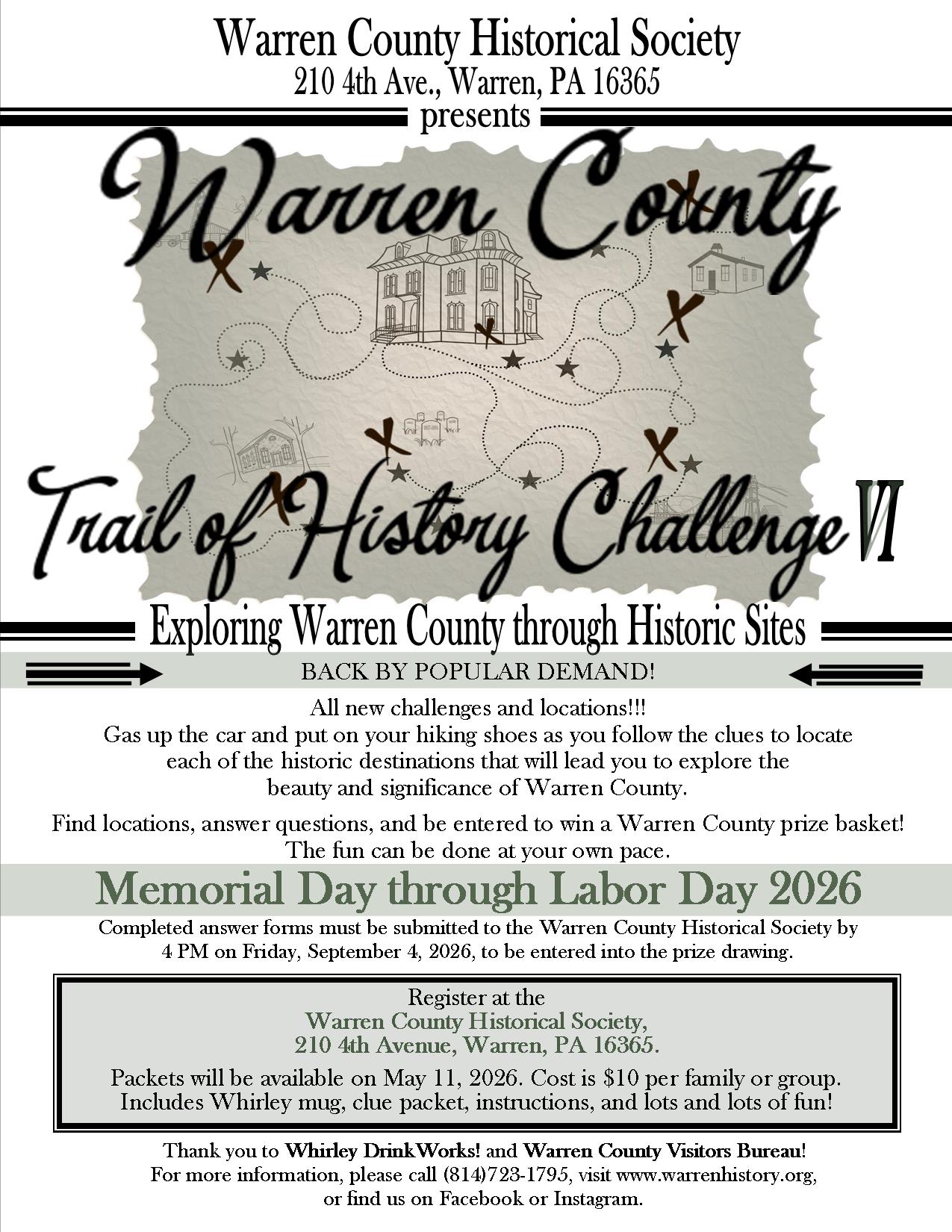 Warren County Trail of History Challenge VI Packets available May 11, 2026, at $10 per team Warren County Historical Society 210 Fourth Avenue, Warren, PA